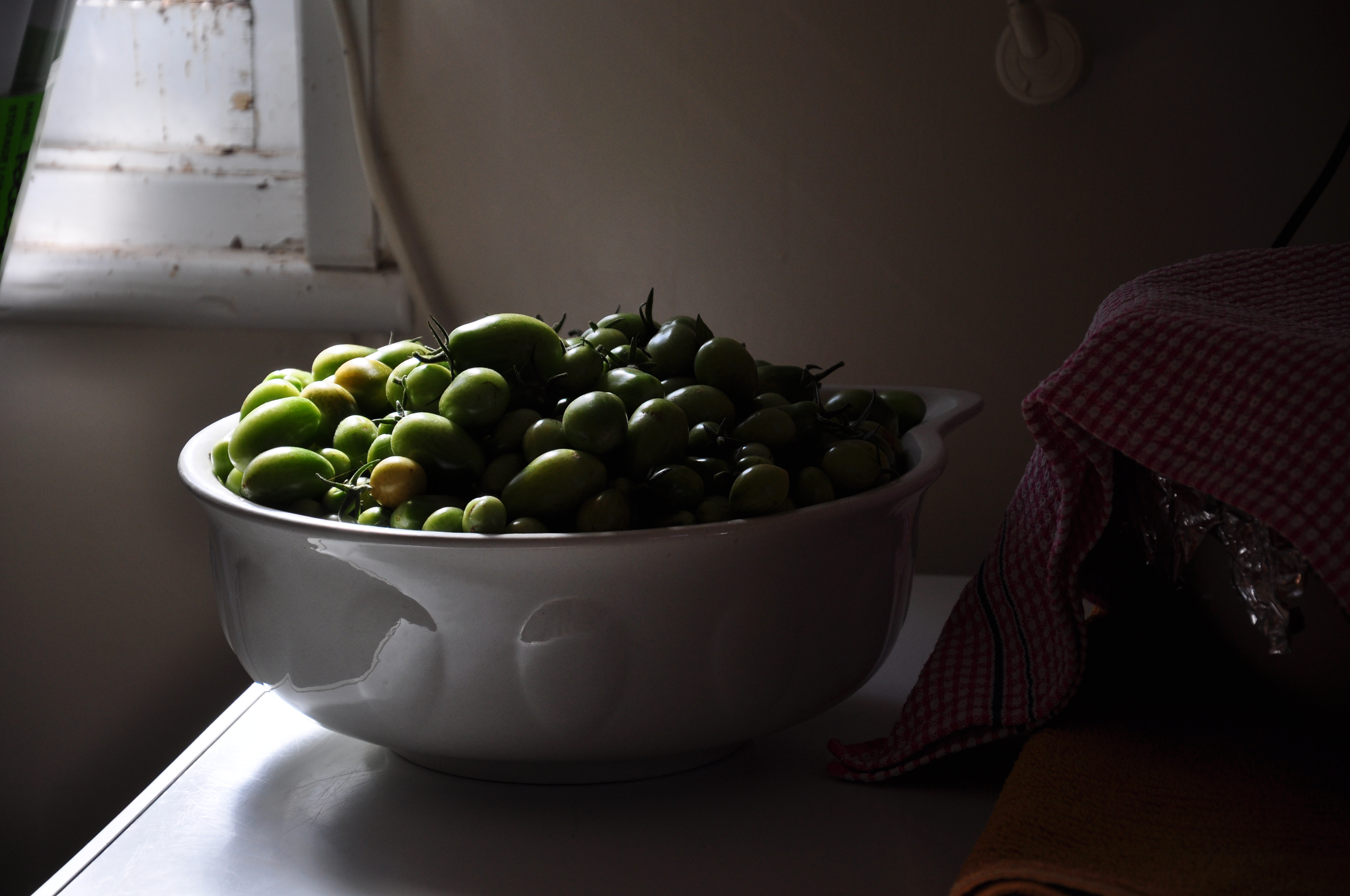 The last of the green tomatoes have been pulled off the vines to be made into a green tomato chutney. To be honest, we didn’t really get to enjoy any ripe tomatoes this season. The plants went in too late, we had a fairly mild summer and our autumn this year was non-existent. Though we’ve had many cold days (comparatively speaking of course!) already, today’s temps marked the true beginning of a long and windy winter, and with the threat of our first frost any day now, there was a sense of urgency to preserve any meager evidence of a tomato crop.