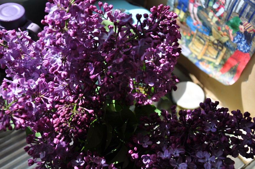 The weather yesterday was just beautiful. The light was golden and warm and heavy with the scent of flowering lilac. I love to keep flowers on the plants as they always last so much longer that way, but can’t resist bringing some inside. Lilac flowers for such a short time, so I really savour that scent while it lasts. Ignore the dirty windows in the photo – just focus on the lilac!